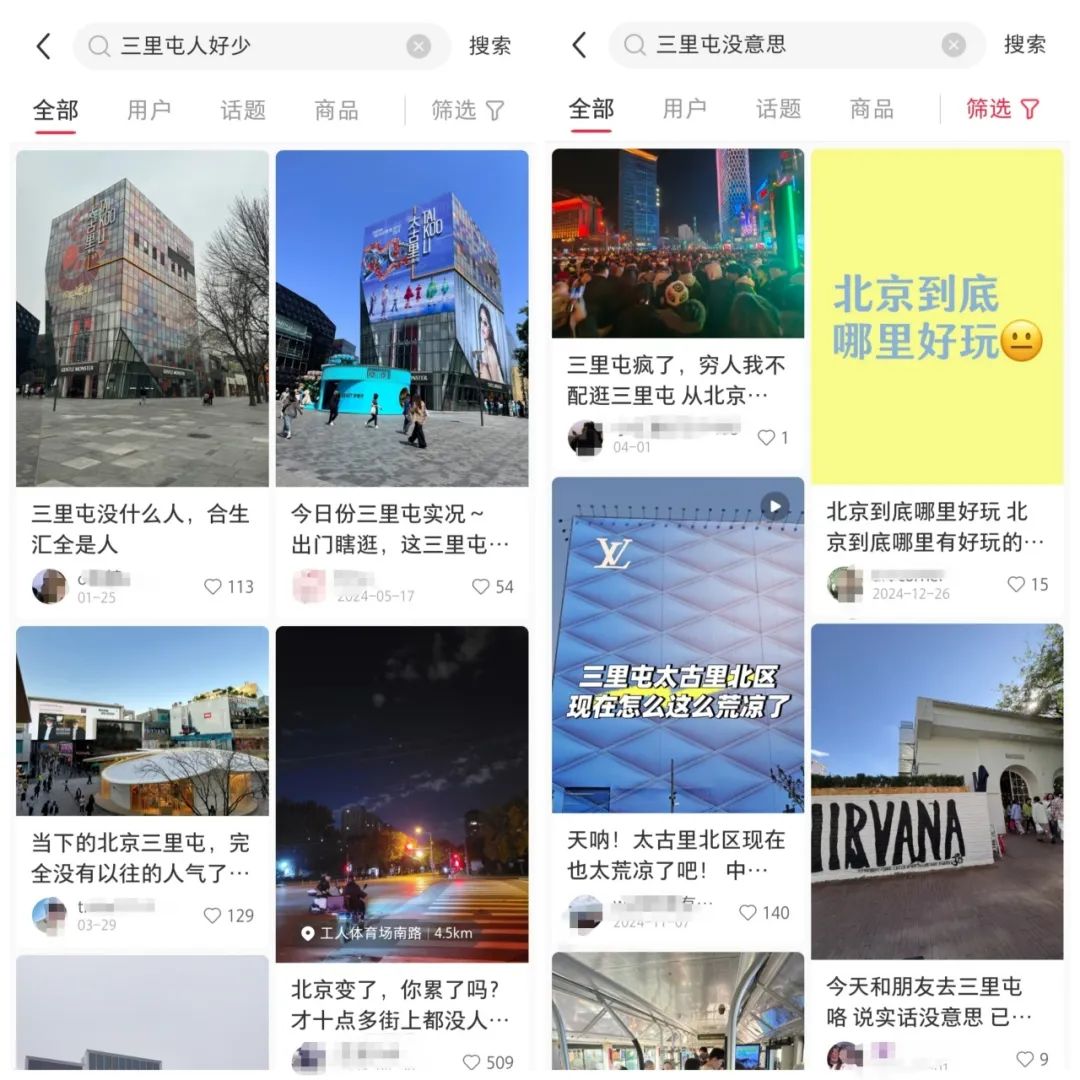 在小红书里,搜索三里屯最近的笔记,很容易翻到2024年,说明笔记的数量很少。在这些时间较近的笔记中,“三里屯无聊”和“三里屯人少”的相关内容比比皆是。