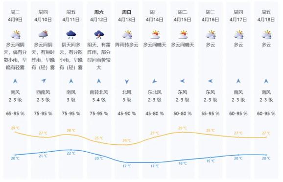 四月九日,多云间阴天,偶有小雨分散,早晚有轻雾;气温20-29℃;南风2-3级;相对湿度为65%-95%。