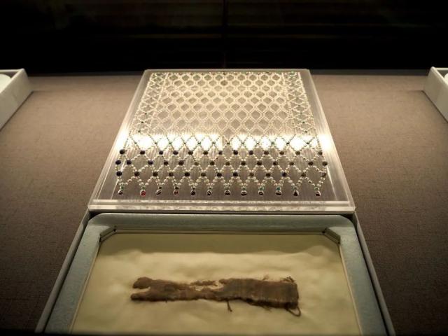 修好的王冠纺织品衬在定制的展示盒里。(新华社记者白玛央措 摄)