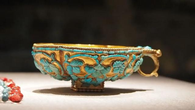 修复后,嵌入绿松石四曲邈指金杯。(新华社记者白玛央措措 摄)