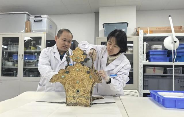 黄希(右)和中国社会科学院科技考古与文化遗产保护重点实验室助理研究员修复王冠。(受访者提供图片)