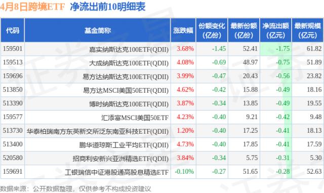 当天有 25 只跨境 ETF 资金净流出出现在基金中,其中嘉实纳斯达克排名第一。 100ETF ( QDII ) (159501),份额下降 1.45 一亿份,净流出额为 1.75 亿元。