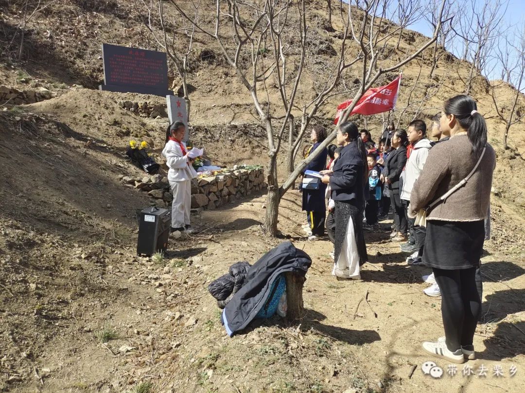 “所有人都站起来,向烈士鞠躬!”春天的阳光透过栗林,在斑驳的无名烈士墓碑上洒下一点金辉。20多名学生、家长和村民慢慢弯腰,看起来端庄。