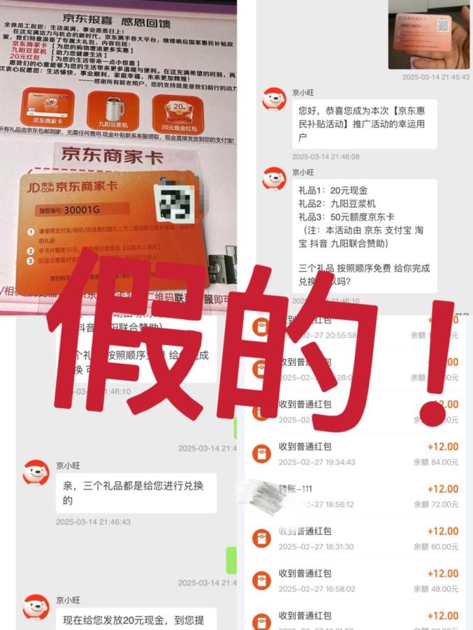 诱导进入。收到“JD.COM商户卡”,声称扫码可以收到豆浆机、红包等礼物。扫描二维码后,被拉进微信群,群内“助手”以“各种电商活动”的名义诱导参与“活动”。
