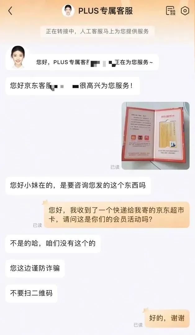 陈女士收到了含有“京东超市卡”的生疏包裹。