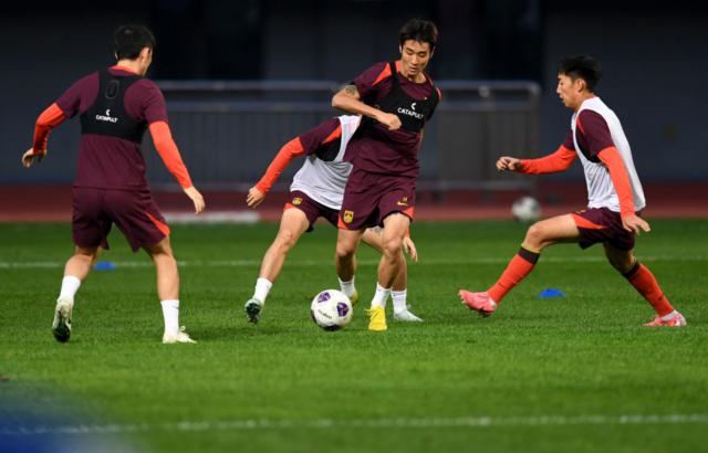 △在青岛国鑫体育场,中国国家男子足球队赛前训练。新华社