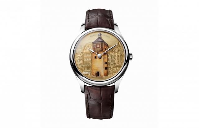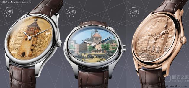 第2款手表采用机刻雕刻和微绘珐琅工艺制作,同样采用 950 铂材料,勾勒出简单的黑线,并在 18K 将手工雕刻和大明火珐琅工艺融入3N黄金表盘。表盘中央的 Tour de l ’ Î le 钟楼采用明火微绘珐琅工艺绘制,明显不同于周边建筑。周围的建筑装饰着丰富多样的雕刻图案,增强了盘面的深度和建筑的透视效果,整体上更加精准生动。