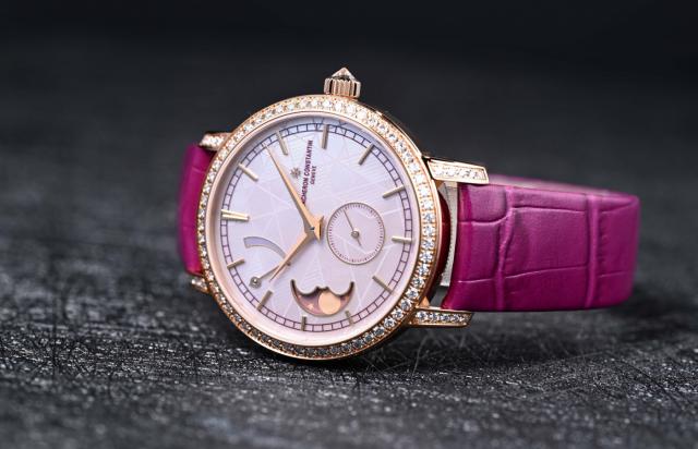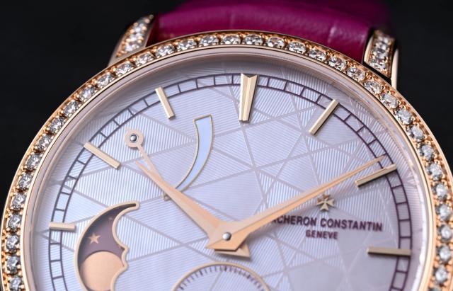 Traditionnelle 传播系列月相手表组合 18K 5N 粉红金 36 mm直径表壳,纤细表圈和表耳镶嵌 80 一颗钻石,专为女性设计。珍珠贝母表盘 2 点下方的立体马耳他十字标志是起点,向四周扩散线条,将整个盘面分散成几何图形。珍珠贝母和表圈裸钻相互呼应,表现出温柔和光辉。