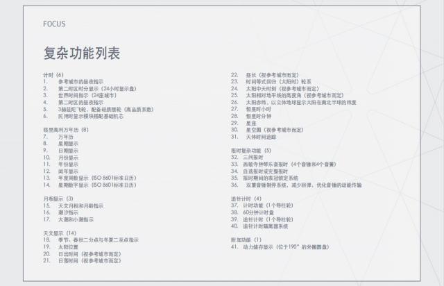 41 该功能不仅包括民用时间、太阳时间和恒星时间三种时间系统的展示形式,还包括 14 项天文功能和 1 世界上首创的天体时间跟踪功能,以及独占性 7 西敏寺三问报时专利申请功能。