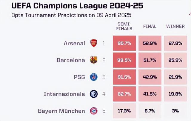 再加上昨天的阿森纳 3:0 皇马,国米 2:1 拜仁,欧冠 1/4 决赛首回合 3 所有的比赛都停止了比赛,外媒 Opta 还迅速更新了本赛季冠军杯夺冠的可能性;阿森纳 27.8% 居首,巴萨以 25.9% 随后,两队进入决赛的几率都超过了 50%。大巴黎 21.9%,国米 19.8%,拜仁 3%,皇马 0.9%,维拉 0.8%,多特更加尴尬。 0%。