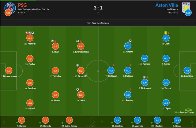 北京时间 4 月 10 日,欧冠 1/4 决赛第一轮继续战斗。巴黎圣日耳曼,已经提前锁定了法甲冠军,坐在主场王子公园球场,迎战英超阿斯顿维拉。罗杰斯在这场比赛中的进球曾经帮助维拉在客场获得。 1-0 领先,但是杜埃、克瓦拉茨赫利亚和门德斯随后联入。 3 球队,协助大巴黎主场 3-1 逆转晋升!