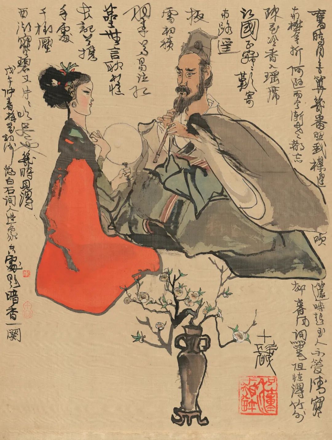 程十发先生作为20世纪中国画坛的大家,以独特的艺术语言重构了人物绘画的传统范式。他的作品创作题材广泛,风格鲜明。他的书中人物,无论是优雅的民族少女,简单的放养孩子,还是紧张的戏曲人物,形神具化的历史文人,都用简洁的线条勾勒出形象,用浓密的墨色点缀着魅力。并且,他经常用书法来画画,笔势畅涩中蕴含着节奏。《晚香图》线条如行云流水,衣纹走势如深涧飞瀑,在顿挫提按间尽显人物灵动的生命感。程十发先生善用减笔,线断意连,眉目生动的精准刻画,既凸显了文人笔墨的优雅,又融入了民间艺术的朴拙生机,有着“离形似”的新境界。《李时珍先生的雕像》是用传统人物的雕像构图画出来的。李时珍住在画面中间,左手拿着草帽,左手拿着药典,靠近古松石。配以大笔飞墨,小笔点睛之笔,将其医者仁心、充满正气的形象描绘得入木三分。
