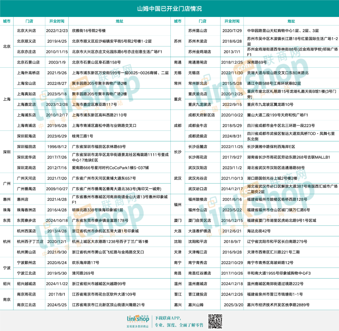 2015年以后,随着中国消费升级趋势的出现,山姆加速扩张,特别是2020年以后,每年开店5-6家。2024年,包括首次进入泉州晋江等县级市场在内的6家新店。2025年将是山姆在华开店最密集的一年。计划开设嘉兴、合肥等多个城市的7家新店,其中张家港将成为第三家“县级店”。