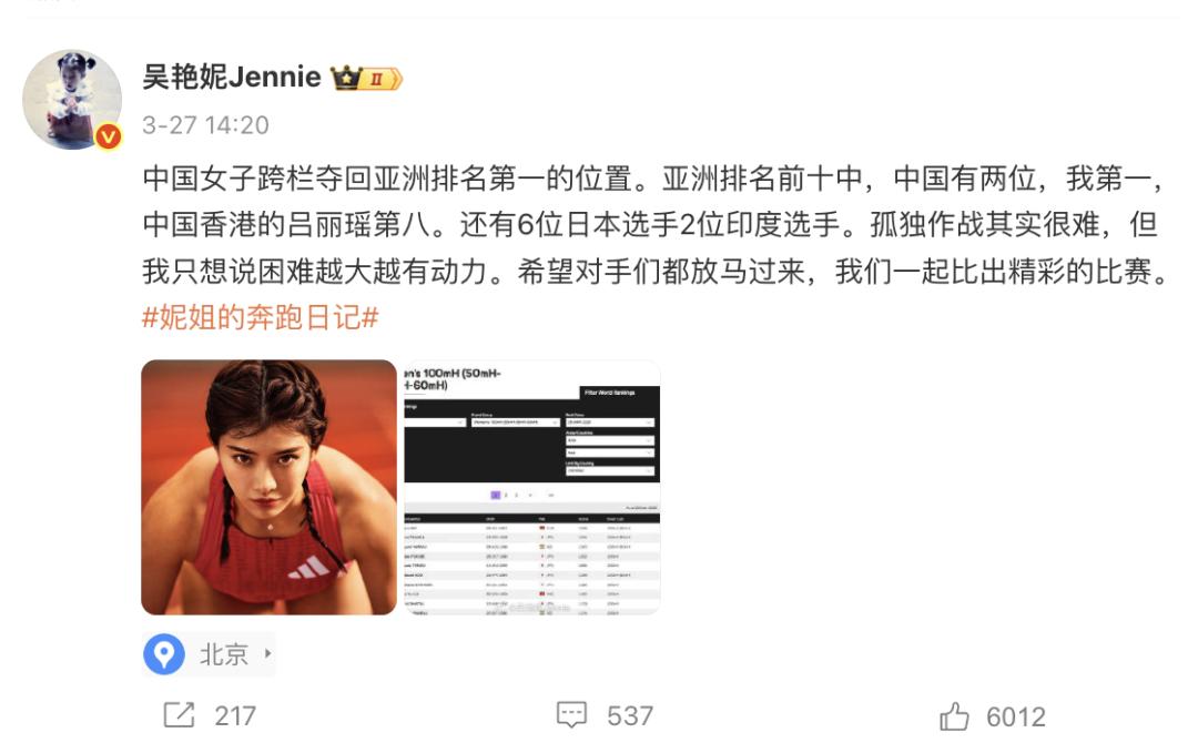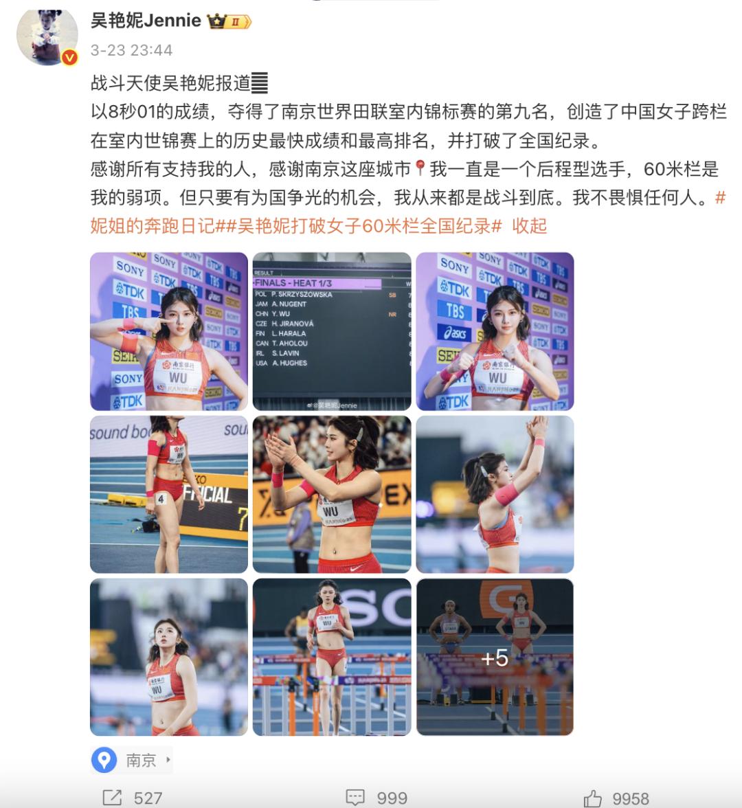 与过去玩家倾向于低调克制的社交风格不同,吴艳妮在社交平台上一直保持着高频的声音,并将其视为“自我报道的家”。3月23日,她在微博上报道了自己的室内世界锦标赛成绩:“以8秒01的成绩获得南京世界田联室内公开赛女子60米栏第九名,在室内世界锦标赛上创造了中国女子跨栏历史最快的成绩和最高的排名,打破了国家纪录。”五天后,她再次更新:“中国女性跨栏重返亚洲第一。在亚洲前十,中国有两个:我是第一,吕丽瑶是中国香港第八。”后来,她写道:“孤独的战斗其实很难,但是我只想说,困难越大,动力越大。但愿所有的对手都放马。”