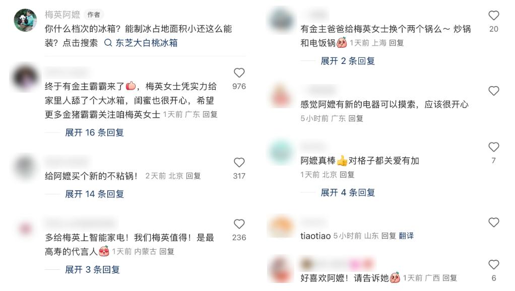 @梅英阿嬷 虽然我已经90岁了,但我会熟练使用果汁机、豆浆机等家用电器。所以很多网友说有没有“金爸爸”可以给梅英女性换更多的智能家电,说“我们妈妈值得!是寿命最长的代言人”。现在,@梅英阿嬷 东芝冰箱广告是小红书上最新的家用电器合作。