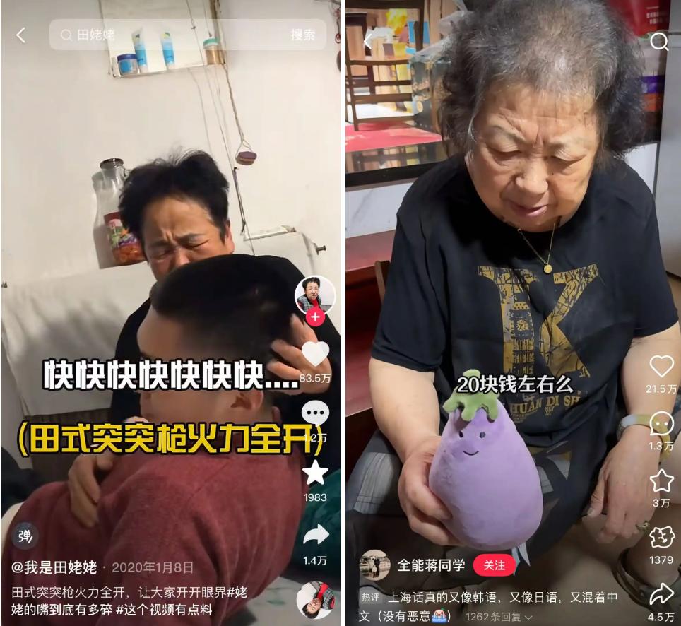 最早是 @潘奶奶,@我是田姥姥,他们拍摄乡村生活的日常生活,展示当地的乡村美食;然后就出现了时髦的衣服和化妆品,比如 @汪奶奶,@看看和爷爷,只有高跟鞋,内容变得更加垂直,比如, @看看和爷爷 帐号更新的是爷爷穿孙子服装的日常生活;与此同时,制作美食、展示手工艺品等内容也颇受欢迎。