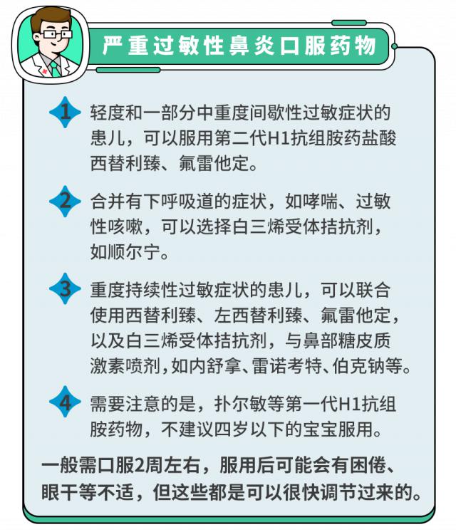 但是如果小孩过敏不严重,不要使用激素,那可以选二代氮卓斯汀、左卡巴斯汀等抗组胺鼻喷剂,遵医嘱使用。
