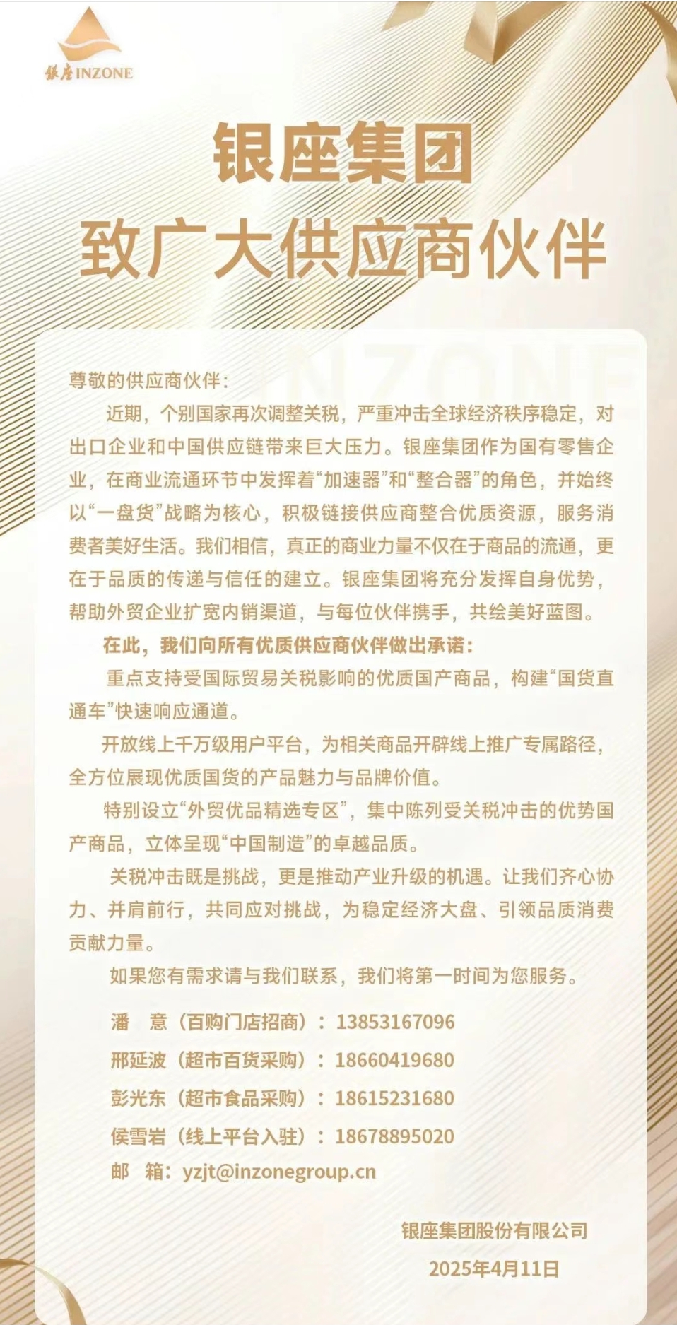 4月11日,银座集团在其微信官方账号上发布了一封给供应商合作伙伴的信。银座集团认为,真正的商业力量不仅在于商品的流通,更在于质量的传递和信任的建立。集团将充分发挥自身优势,帮助外贸公司拓宽自销渠道,与每一位合作伙伴携手共创美好蓝图。