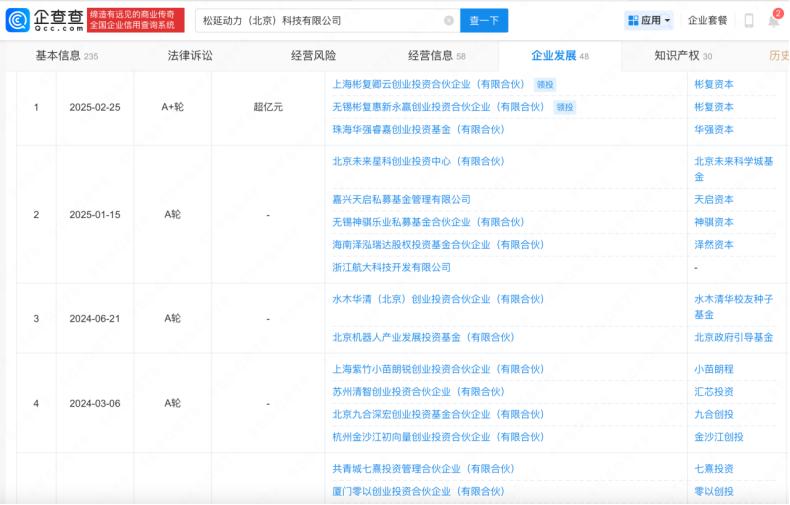而且松延动力是目前A轮阶段融资最频繁的人形机器人公司。天眼查数据显示,自去年3月进入A轮以来,松延动力已完成A轮系列融资4次,在A轮阶段“长跑”达到13个月。这家成立于2023年9月的公司已经完成了五次融资,但仍然没有进入B轮大门。