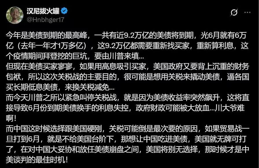 最近美国国债利率飙升也是类似的情况。我想通过征收关税来赚一些钱。结果,全球金融市场动荡,投资者开始出售他们的美国国债。国债利率飙升,导致美国不得不高息发行债券,进一步增加了美国国债的利息负担。