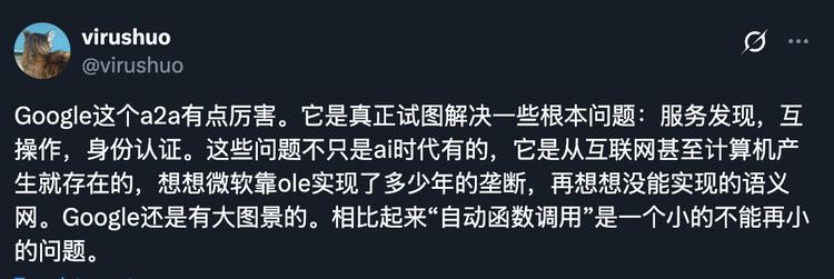 Google在这一系列关键产品发布的背后,深知成为标准制定者的重要性, Agent走向繁荣的关键节点,它肯定不希望所有的AI。 Agents听Anthropic的话。Google希望AIIs Agents 无处不在,而且要让它们都建立在Google的生态中。