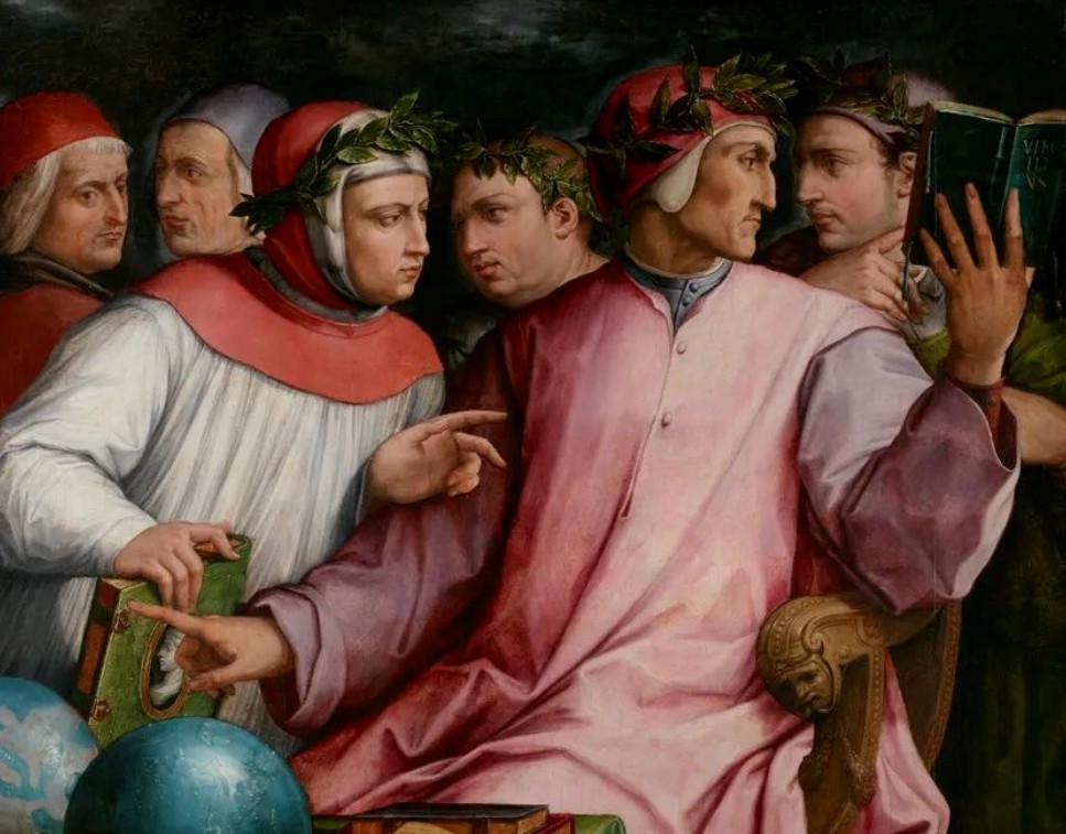 插图:意大利艺术家乔治·瓦萨里画了六位托斯卡纳诗人,描述了六位著名诗人一起阅读的场景(右二持书的是但丁)。