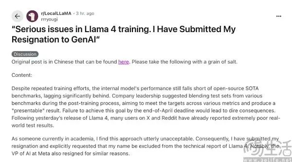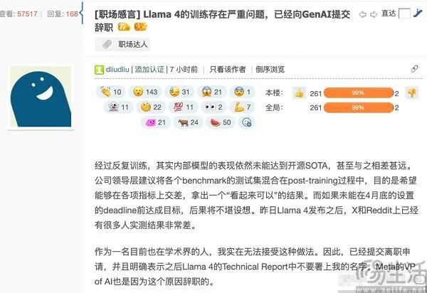 接着又到了北京时间本周一上午,有人在北美著名留学论坛“一亩三分地”上爆料,Llama 4实践不如预期,企业领导层建议在实践后期将基准测试的测试集数据混入培训数据中,以达到更好的基准测试结果。