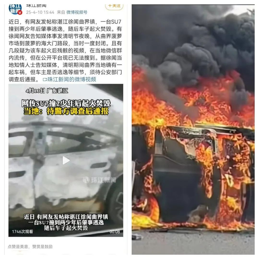 小米高速起火事故刚刚平复,有媒体曝光湛江徐闻一辆小米SU7连撞两人后起火。