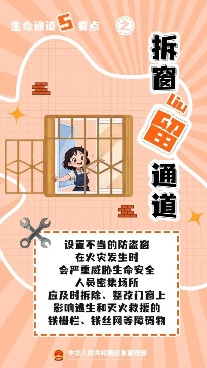 注意消防设备、逃生设备的位置和使用方法,如遇火灾,请规范使用,确保安全。