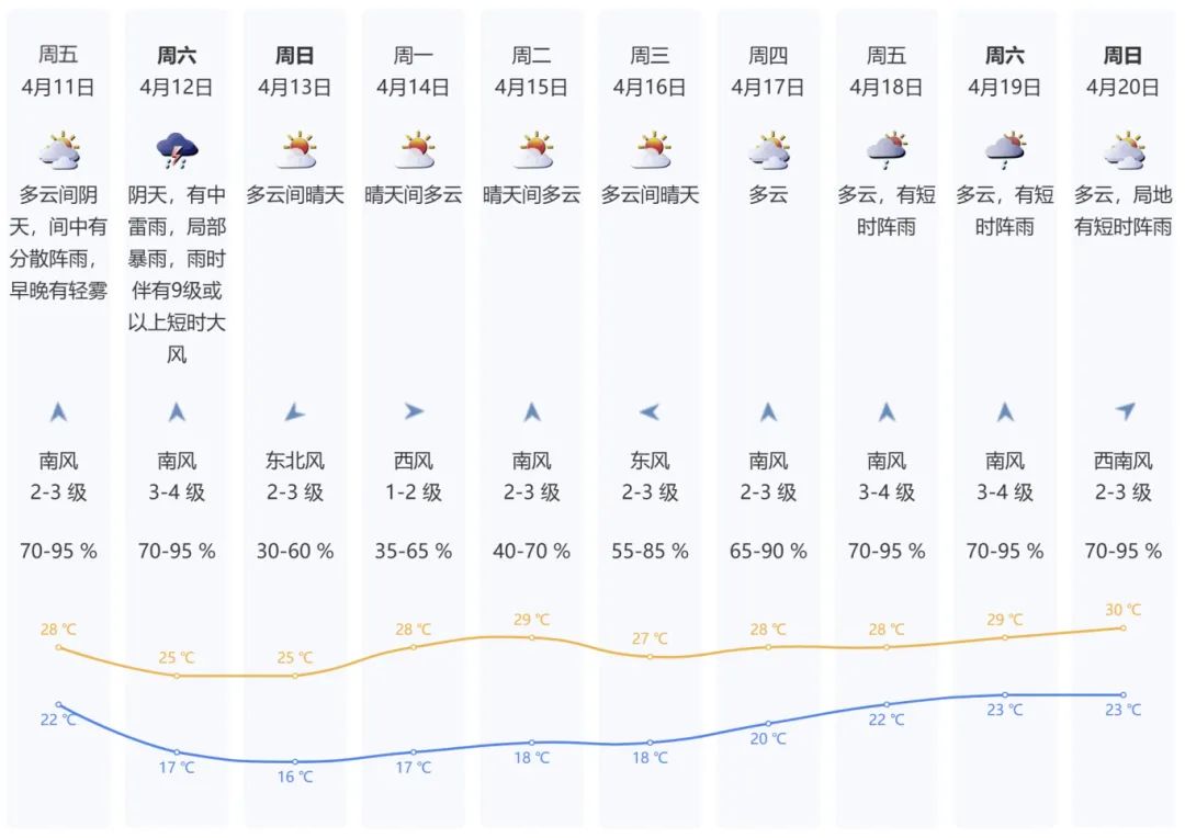 四月十一日,多云间阴天,中间有分散的阵雨,早晚有轻雾;22℃-28℃;南风2-3级;相对湿度为70-95%。