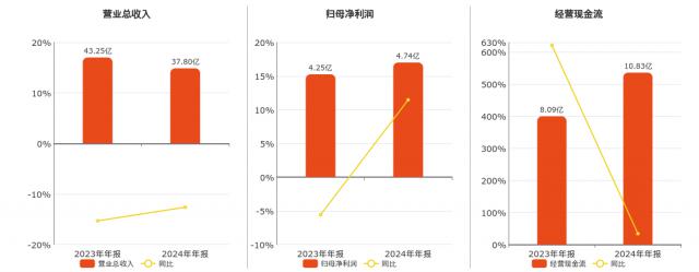 企业总营业收入为 37.80 与去年同期报告期营业总收入相比,亿元减少 5.45 与去年同期相比,亿元有所下降。 12.61%的归母净利润。 4.74 十亿元。经营活动现金净流入 10.83 亿元。
