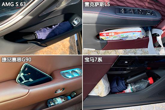 车内储物空间方面,AMG S 63 全车储物空间(除杯架外)数量最多,达到 18 个,雷克萨斯 LS 数量至少,但也达到了 12 个。在实际测量中发现,只有捷尼赛思 G90 和雷克萨斯 LS 提供了墨镜专属放置空间,细节考虑周全。另外,两款德系车型还有改进的空间。