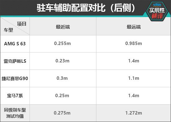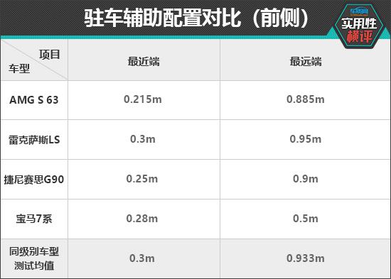 在前驻车雷达检测中,根据现有的测试数据,宝马进行了驻车辅助配置, 7 雷克萨斯系雷达的功率表现一般。 LS 接近同级别车型的平均检测值。在最近的提醒距离方面,雷克萨斯 LS 与其它三款车型相比,性能更好,测试结果与同级别车型相同。