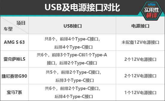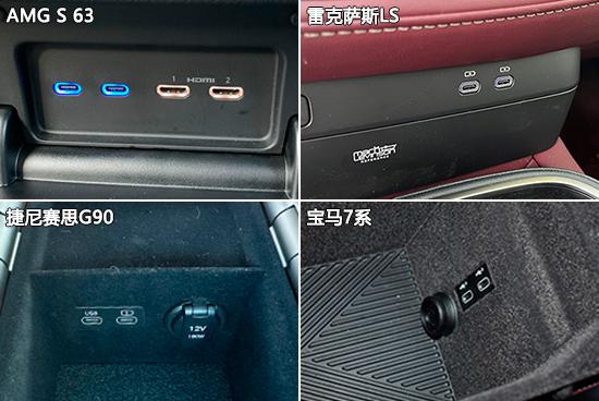 在充电插座方面,AMG S 63 在数量上优于其他三款车型,整车共配置。 8 个 USB 接口,但只提供 Type-C 类型接口。雷克萨斯 LS 虽然接口数量不如 AMG S 63,但是前排提供了两种类型的接口,对充电设备的兼容性更好。12V 关于电源接口,雷克萨斯 LS 和捷尼赛思 G90 均配备 2 个 12V 电源接口;AMG S 63 则是未配置 12V 电源接口。