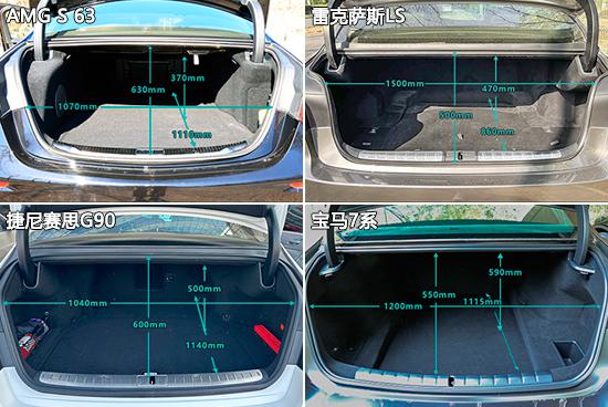 在后备箱方面,四款车的后备箱平整,但由于配备了第二排座椅的电动调节功能,座椅无法放下,收纳空间无法进一步扩大。我们测量了四款车后备箱的实际载货能力,宝马 7 该系统的测试数据超过了同级别车型的平均测试值,综合性能略优于其它三款车型。