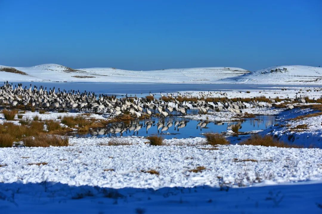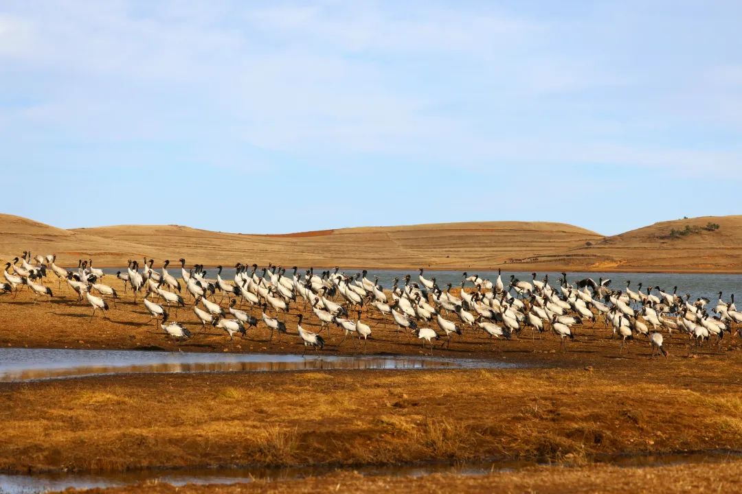数据显示,2024年冬季,共有2178只黑颈鹤飞往山包过冬,再加上昭通永善、价格、巧家,全市冬季黑颈鹤超过2500只。