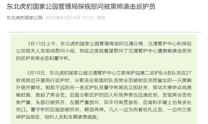 3月10日,东北虎豹国家公园6名队员在进行常规巡逻时,一名队员被一只黑熊从树后突然跳出来咬了一口,另一名队员在救援过程中脑部被黑熊抓伤。