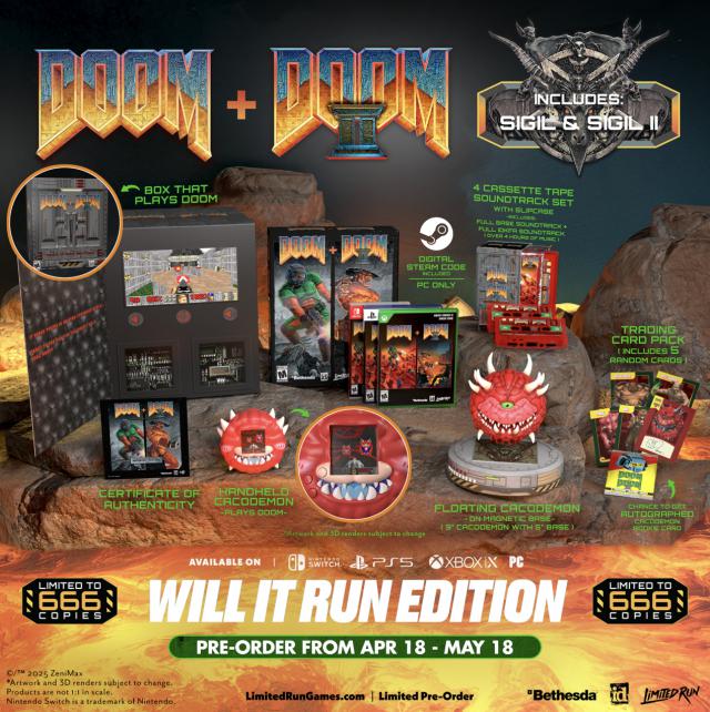 就游戏套装而言,这款游戏 Big Box 除了游戏本体之外,豪华型还提供原声盘磁带、游戏实体纪念卡; Will It Run 有限版本的包装盒自带屏幕趣味正版《毁灭战士》游戏,并且提供游戏收藏证书,怪物 Cacodemon 手办、怪物 Cacodemon 造型游戏机(同样可以玩正版《毁灭者》)、原声盘磁带,游戏实体纪念卡。