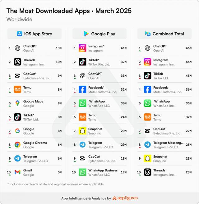 Appfigures 数据显示,2025 年 3 月,ChatGPT 以 4600 万次下载已经成为世界上最受欢迎的非游戏应用,超越 Instagram(4600 万次)和 TikTok(4500 万次)。