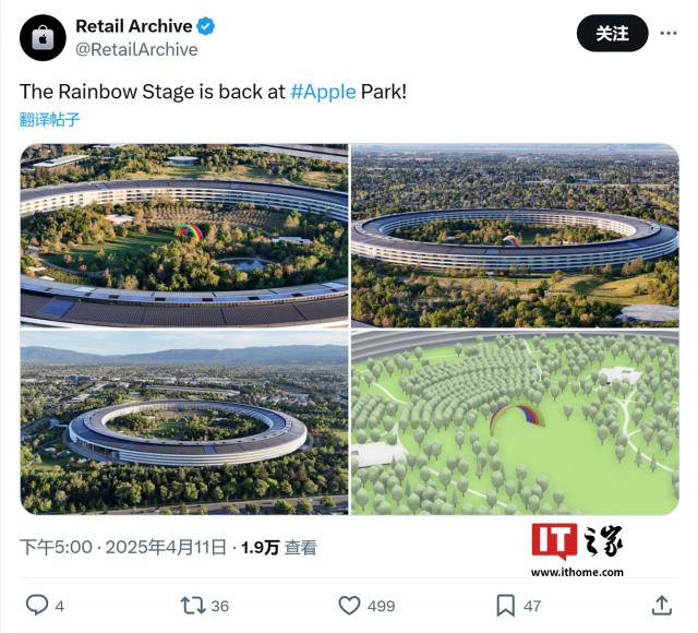 IT 世家 4 月 12 科技媒体日新闻 9toMac 昨日(4 月 11 日)发布博文,报道称苹果为迎接苹果公司。 2025 全球开发者大会(WWDC),在 Apple Park 彩虹拱门在总部园区重新安装。