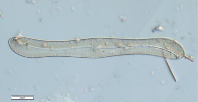 它是一种附着或底栖性硅藻,其结构十分独特,藻体略呈“S“形状,壳面中间宽,两侧变窄,尾端膨大略呈刀形,表面水平和垂直线交错成网格状,长度可达218μm,生活在河口的微咸水中,对环境变化非常敏感。