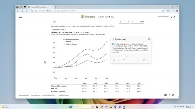 微软加强了图像描述功能。(Narrator),如今 Copilot PC 支持阅读各种图片的描述,帮助群体理解照片中到底有什么东西。例如,对于一张展示股票表现的图表,用户将获得以下详细说明。“图表显示了微软公司的股价,包括 S&P 500 及 NASDAQ 计算机指数,图表显示从 6 月 18 日至 6 月 23 日间微软股价稳步上涨”。
