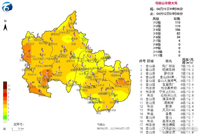 4月11日19时至12日7时,我市普遍下降至中雨,共有109个车站下雨,其中57个车站超过10毫米,最大的当涂乌溪排水站为22.9mm。全市有4个站点出现7级以上阵风,最多15.3米/秒(7级,12日6时43分)含山陶厂祁首站。