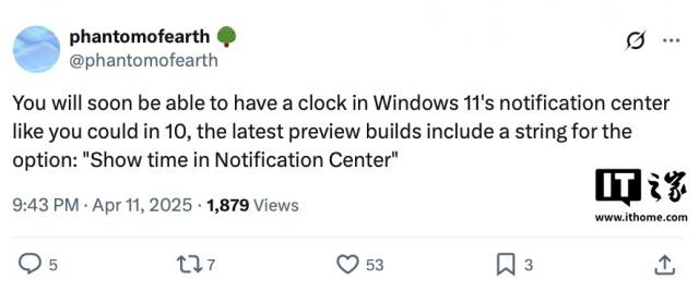 但是数据挖掘者 @PhantomOfEarth 发觉,微软在 Windows 11 Build 26100.3902 在通知中心悄悄加入了一行“加入时钟”(Show time in Notification Center)"功能性文字描述,相应的代码暗示 Windows 10 未来旧版任务栏日历弹窗布局将以某种方式回归 Windows 11。