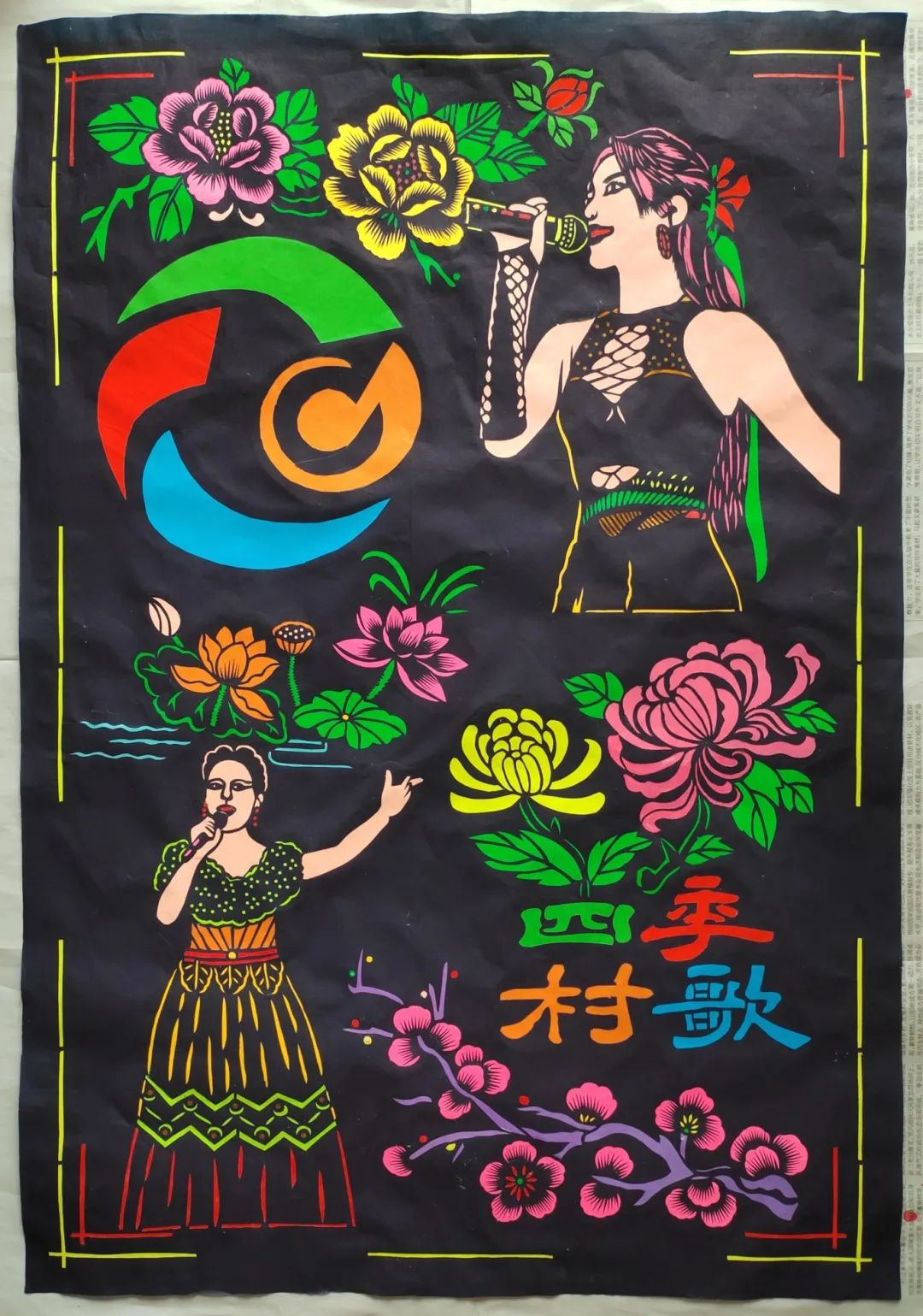 一把剪刀和一张彩纸可以在指尖旋转之间产生生动的图案。王世义老人巧妙地将这个对家乡美好生活的愿望融入到剪纸艺术中。作品的圆形构图象征着完美和团圆。绿色、红色、橙色和蓝色像聪明的画笔,勾勒出一年四季独特的风景。牡丹花、莲花、菊花、梅花盛开,分别代表着春夏秋冬。