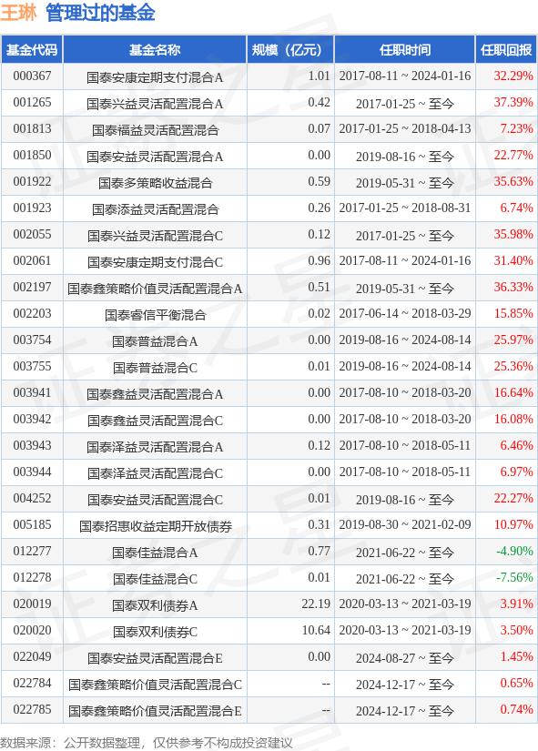 王琳女:中国国藉,博士生。2009 年 2 每月加入国泰基金,曾任研究员、基金经理助理。2017 年 1 从2017年起,2017年,任国泰兴益灵活配置混合型证券投资基金的基金经理。 年 1 月至 2018 年 8 2017年,2017年任国泰添益灵活配置混合型证券投资基金的基金经理 年 1 月至 2018 年 4 每月任国泰福益灵活配置混合型证券投资基金的基金经理,2017 年 6 月至 2018 年 3 2017年任国泰瑞信平衡混合证券投资基金基金基金经理, 年 8 月至 2018 年 3 每月任国泰鑫益灵活配置混合型证券投资基金的基金经理,2017 年 8 月至 2024 年 1 国泰健康每月定期支付混合型证券投资基金 ( 原国泰健康养老金定期支付混合型证券投资基金 ) 2017年基金经理 年 8 月至 2018 年 5 月任国泰泽益灵活配置混合型证券投资基金的基金经理,2019 年 5 从2019年起,我担任国泰多战略收益灵活配置混合型证券投资基金和国泰鑫战略价值灵活配置混合型证券投资基金的基金经理。 年 8 从2019年起,国泰安益灵活配置混合型证券投资基金的基金经理 年 8 月至 2024 年 8 每月任国泰普益灵活配置混合型证券投资基金,2019 年 8 月至 2021 年 2 2020年,2020年任国泰招收收益定期开放债券型证券投资基金的基金经理。 年 3 月至 2021 年 3 国泰双利债券证券基金月任基金经理,2021年 年 6 本月起担任国泰佳益混合型证券投资基金基金基金经理。2025 年 1 月 3 日起任国泰悦益六个月持有期混合型证券投资基金的基金经理。2025 年 1 月 3 从那以后,我一直是国泰悦益六个月持有期混合型证券投资基金的基金经理。2025 年 2 月 25 任国泰融丰外延增长灵活配置混合型证券投资基金 ( LOF ) 基金经理。2025 年 2 月 25 日本担任国泰慧益一年持有期混合型证券投资基金主管。