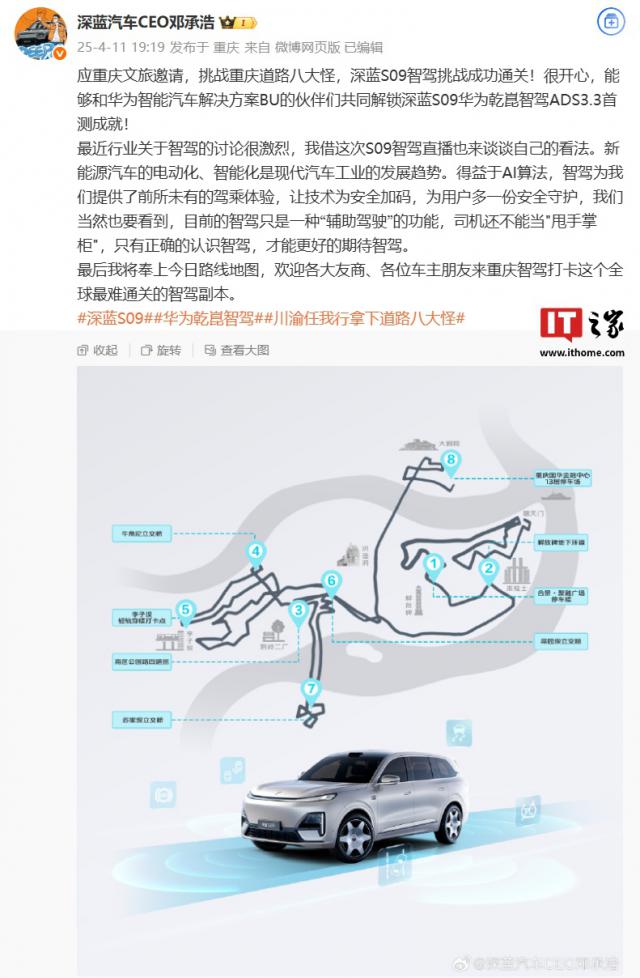 IT 世家 4 月 12 日消息,深蓝车 CEO 昨天晚上,邓承浩发文称,深蓝 S09 中大型 SUV 旗舰新车“重庆八大道路怪物”智能驾驶挑战成功通过。与此同时,他透露,新车将配备华为乾智驾驶 ADS3.3。