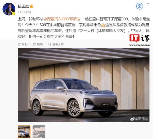 华为智能汽车解决方案 BU CEO 靳玉志说,深蓝色 S09 深蓝是第一款搭载华为乾乾高级智能驾驶和鸿蒙座舱的车型,打造新三大块(冰箱彩电沙发)。