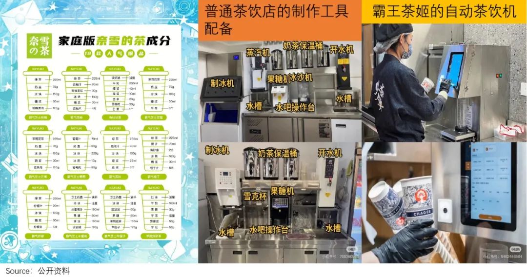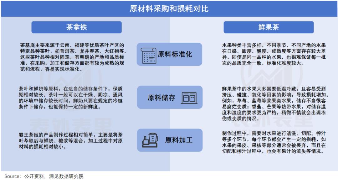 再次看准备阶段,消费比较大:新鲜果茶要有专门的人员,负责洗水果、去皮等,而霸王茶姬只需准备茶叶和牛奶。