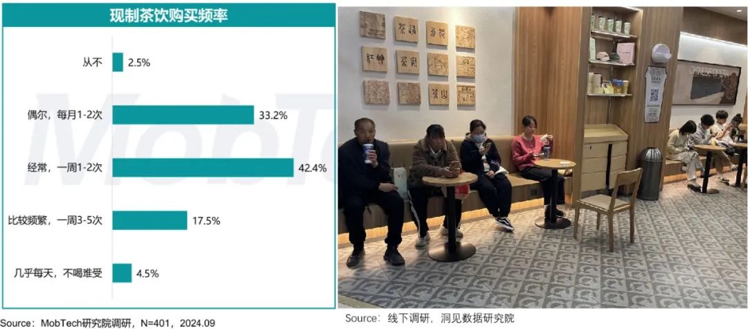 不仅如此,还有机会俘获更多的人。如下图所示,在霸王茶姬店,除了年轻人聚在一起聊天,还有很多大妈坐着炫耀奶茶。